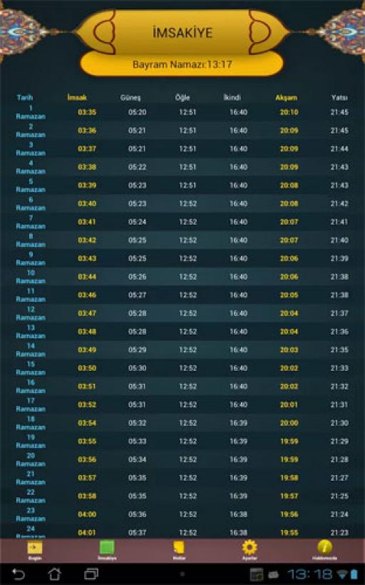 İmsakiye 2013, uygulaması ramazan ayı'na özel imsak ve iftar vakitlerini hesaplayan bir mobil uygulamadır.
