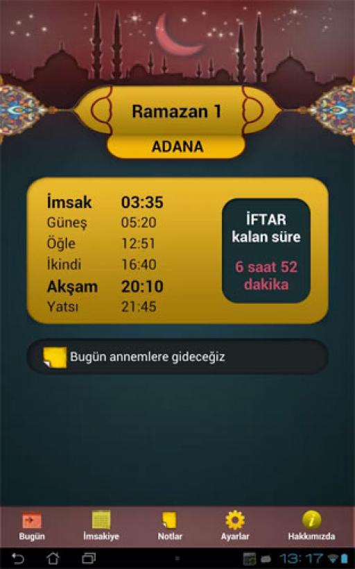 Uygulama, kullanıcılara 2013 yılına ait ülkelerin ve şehirlerin ramazan ayın'a özel olarak iftar ve sahur vakitlerini sayaç olarak gösteren isteğe göre diğer namaz vakitlerinide öğrenmenize olanak veren bir mobil uygulamadır.